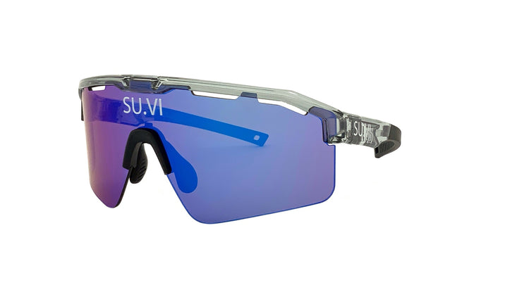 Stiilsed ja funktsionaalsed SU.VI spordiprillid, mis on loodud mugavuseks ja silmade kaitseks igasuguste välitingimuste jaoks. Läbipaistva halli ja musta raami kombinatsioon ning sinine peegelklaas loovad kaasaegse ja sportliku välimuse, sobides ideaalselt erinevateks spordialadeks ja aktiivseks liikumiseks.